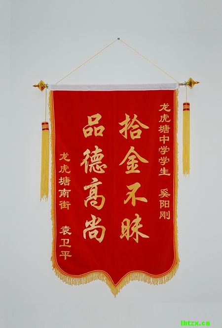 3月11日上午,龙虎塘派出所给我校八(2)班奚阳刚同学送来一面写有“ 拾金不昧,品德高尚”的锦旗,感谢该同学拾金不昧。原来,在8日上午,奚阳刚同学和爸爸一起去菜场买菜,无意中拣到一个黑色钱包,内有许多银行卡、重要证件和现金若干。因为一时联系不到失主,父子俩急中生智,报警叫来了警察,当警察问及俩人姓名时,父子俩始终不肯留下姓名。失而复得的钱包回到主人手里,主人非常感激,特意通过派出所送来锦旗,表扬该同学拾金不昧的良好品质,感谢家长和学校教育出这样品德高尚的好孩子。